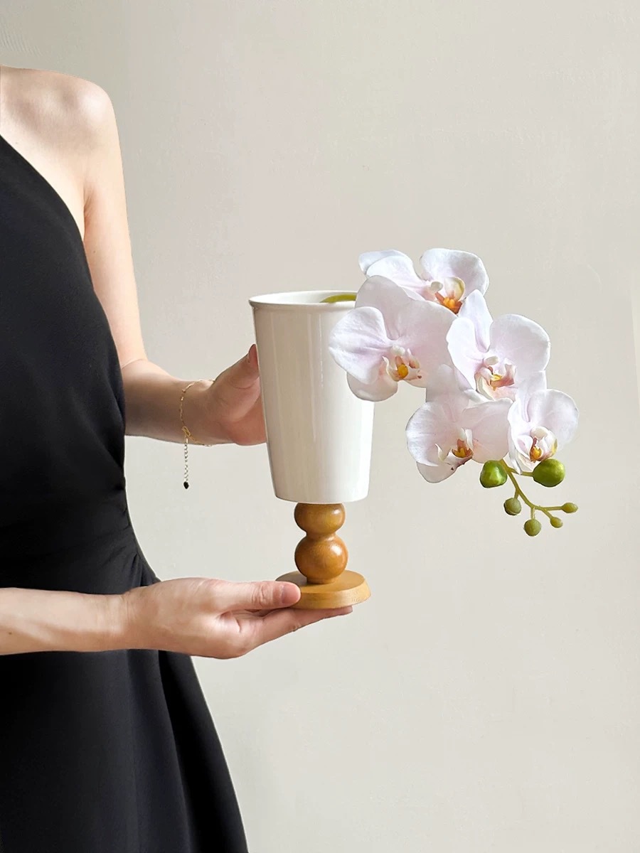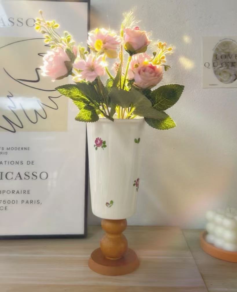 This French retro ceramic vase features an elegant wooden high-foot design that combines vintage romance with modern minimalism. Made of smooth, premium ceramic with fine texture, it delivers a luxurious, high-end look ideal for living rooms and entryways. It can be used as a flower vase for fresh or dried blooms, and also doubles as a stylish aromatherapy diffuser bottle. The classic French retro style easily matches various home decor, adding sophistication and warmth to your space. Simple yet graceful, it is a perfect decorative piece to elevate your home aesthetic.